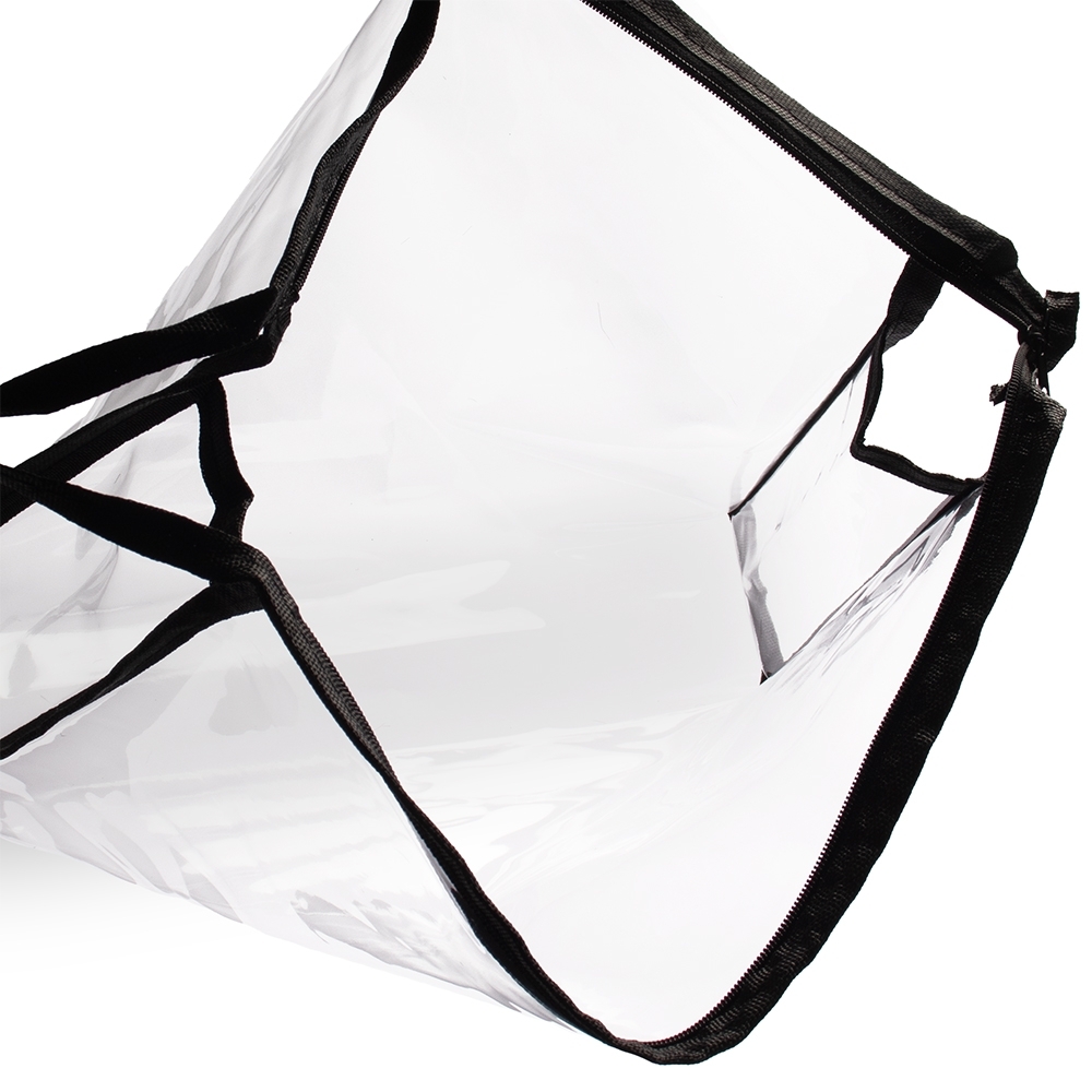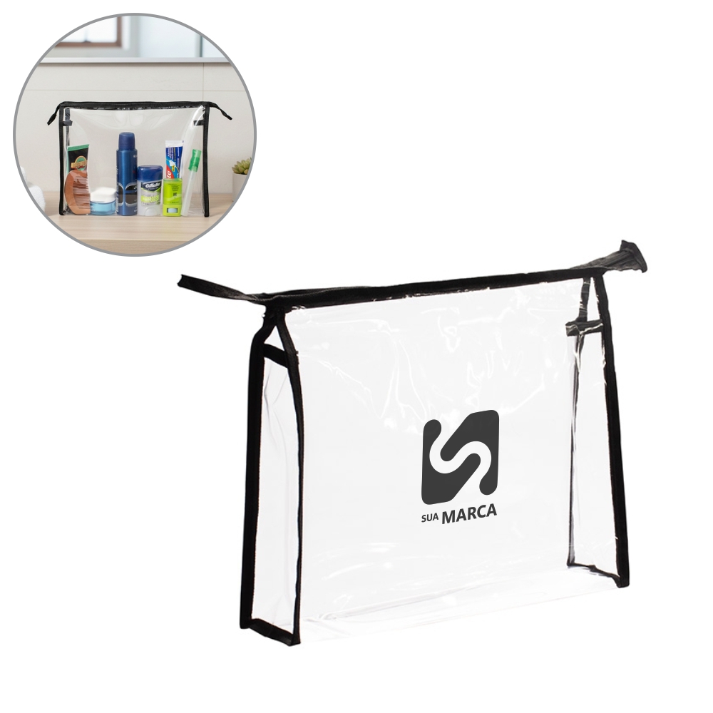 Nécessaire em PVC transparente com fechamento em zíper e detalhes em nylon, incluindo uma pequena alça lateral.